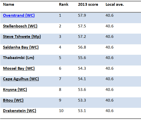 Key findings released by Municipal IQ, a specialised local government data and intelligence organisation, reveal that eight out of 10 top-performing local municipalities are in the Western Cape, with Overstrand topping the list followed by Stellenbosch in second and Steve Tshwete (Mpumalanga) in third place.