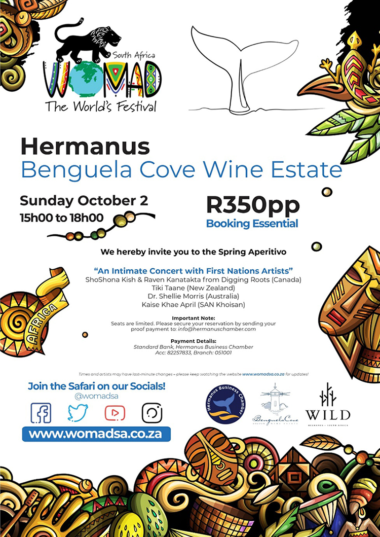 On 2 October 2022, WOMAD Hermanus will feature a First Nations Indigenous Artists Concert at Benguela Cove, Hermanus from 15:00-18:00. Artists Digging Roots (Canada), Tiki Taane (New Zealand), Matthew Doyle & Shellie Morris (Australia) and Kaise Khae April (SAN Khoisan) will join Hermanus music fans in the process of making musical alchemy. There will also be a number of free music workshops for local creatives.