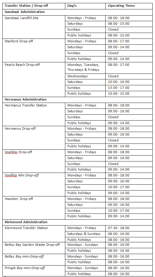 If you generate excess waste over this festive season, please take the additional waste that you generate to one of our facilities for the safe disposal of your waste. The following facilities are available in the Overstrand to assist you with the disposal of your excess waste: Pearly Beach Drop-off, Gansbaai Landfill Site, Stanford Drop-off, Voëlklip Drop-off, Voëlklip mini Drop-off, Hermanus Drop-off, Hawston Drop-off, Kleinmond Transfer Station, Bettys Bay mini Drop-off, Betty’s Bay Garden Waste Drop-off and Pringle Bay mini Drop-off.