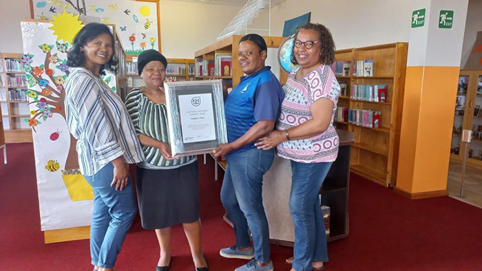 Pictured here are Belinda May (left), Francina Philander and Lucelle Wyngaard of the Hawston Library with Faldelah May (second right).