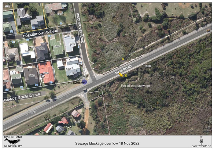 The proximity to the Kleinmond Estuary (near the 2nd footbridge) is a concern. The distance from the overflow site into the stormwater is about 45m until it enters the Middelrivier which enters the Estuary within about 175m.