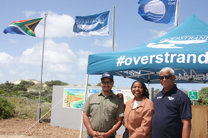 BLUE FLAG FLYING Five Overstrand beaches have been awarded the right to wave the prestigious Blue Flag for the summer. Pictured here are Dencil Arendse, Zandile Bavuma and Desmond Lakey from the Hangklip-Kleinmond Administration.