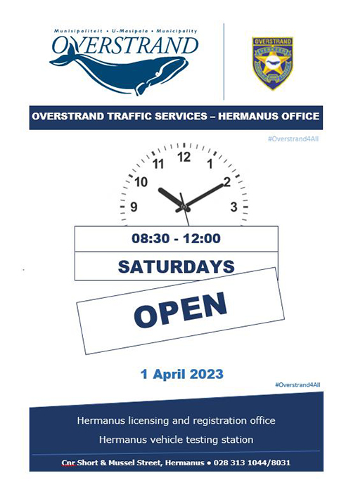 Overstrand Traffic Services in Hermanus is open this Saturday, 1 April 2023, from 08:30 to 12:00 if there is no load shedding on Saturday morning.