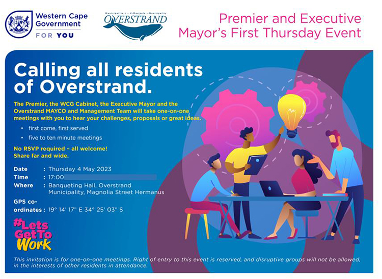 On 4 May 2023, Overstrand Executive Mayor, Dr Annelie Rabie and her team will join Western Cape Premier Alan Winde for his Open Government First Thursday event in Hermanus.