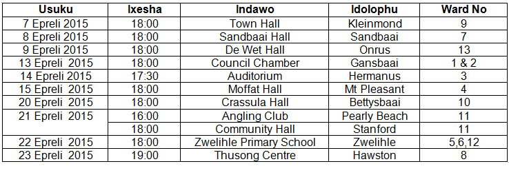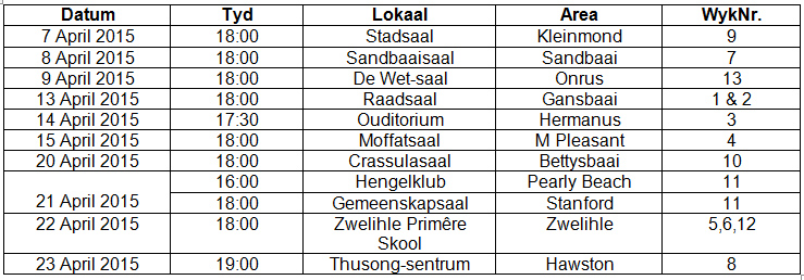 Die openbare vergaderings sal plaasvind op die datums en tye soos aangetoon,: