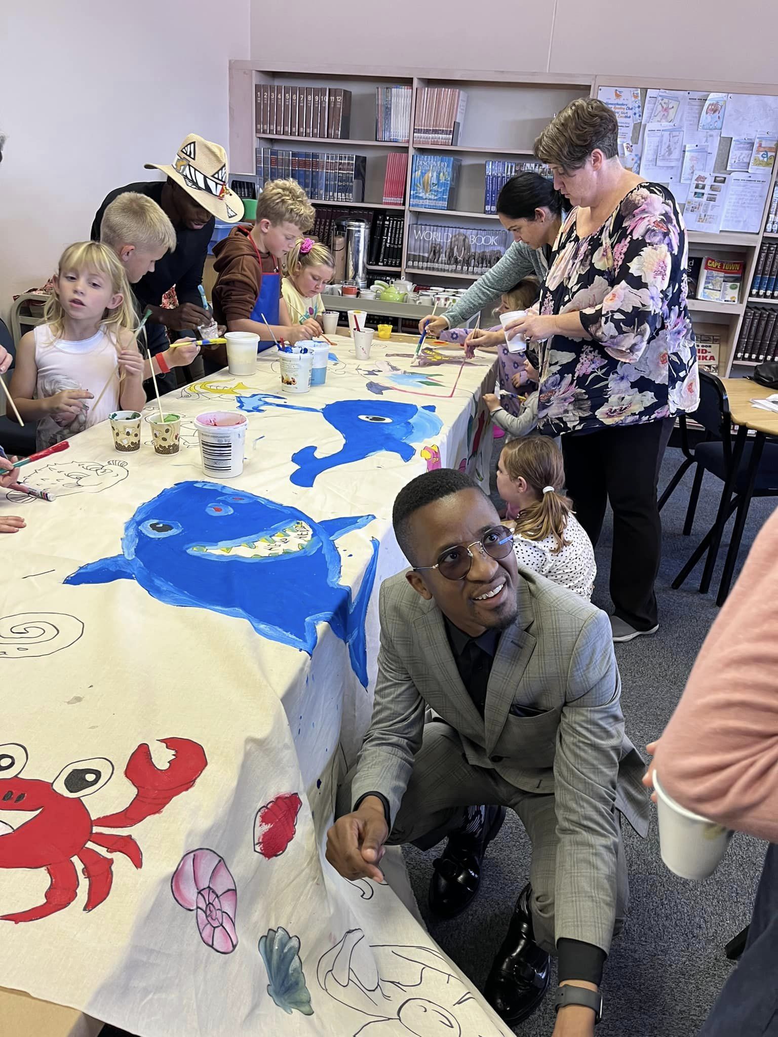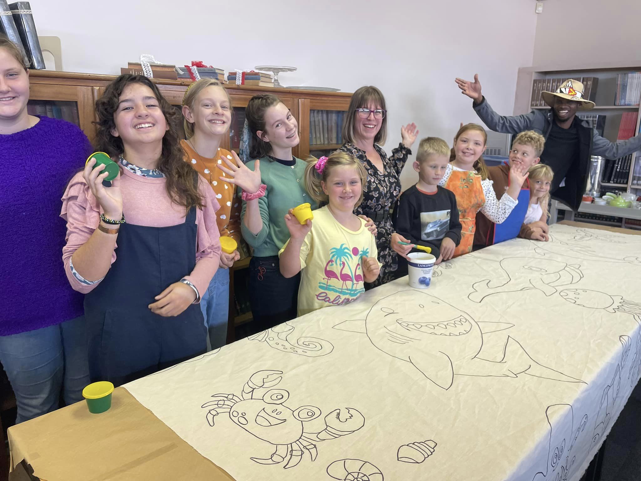 As part of the UNESCO Creative Cities Network, Overstrand Municipality's Library in Hermanus prepared the canvas with marine creatures and the Hermanus Home-schoolers helped to colour it in. With them are Mardee Cita who helped the children with the creative direction.