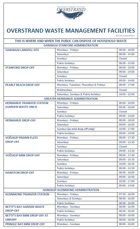 This is where and when the public can dispose of general waste in the Overstrand.