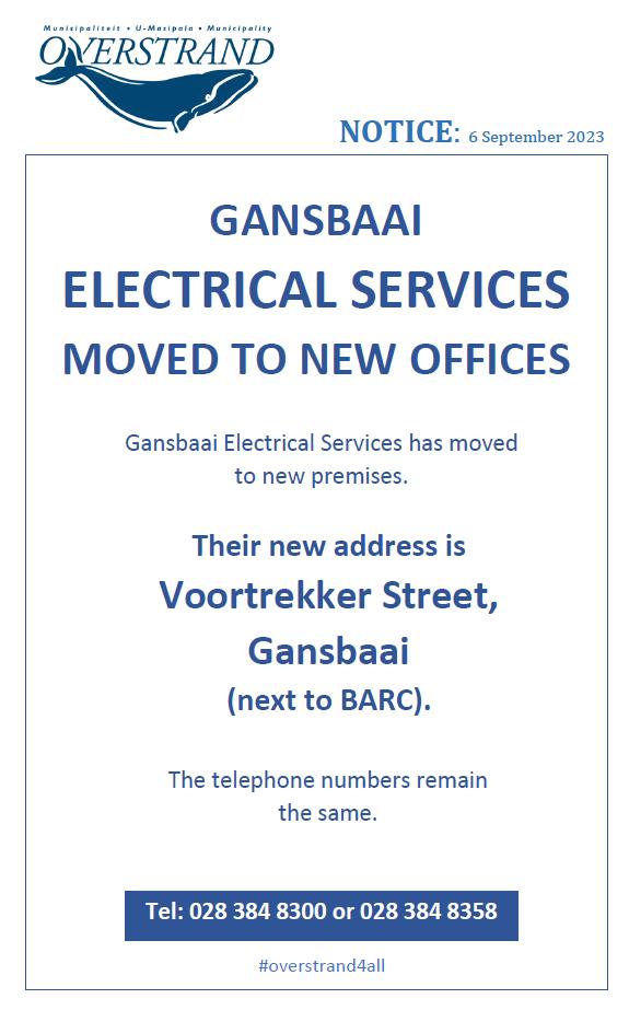 As of 6 September 2023, Gansbaai Electrical Services is operating from new premises.