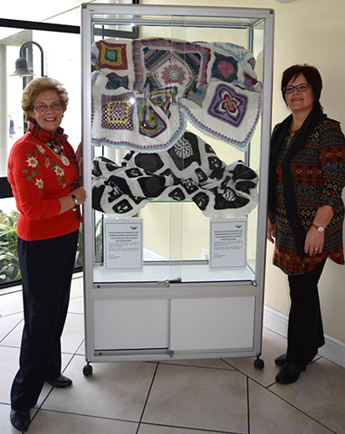 The spectacular multi-coloured and black and white blankets that have been crocheted by Estrellita Engelbrecht and Jane Langenhoven and their respective teams of ladies from the “Hooked on Tuesday” Club are currently on display in the glass cabinet in front of the Hermanus Library.