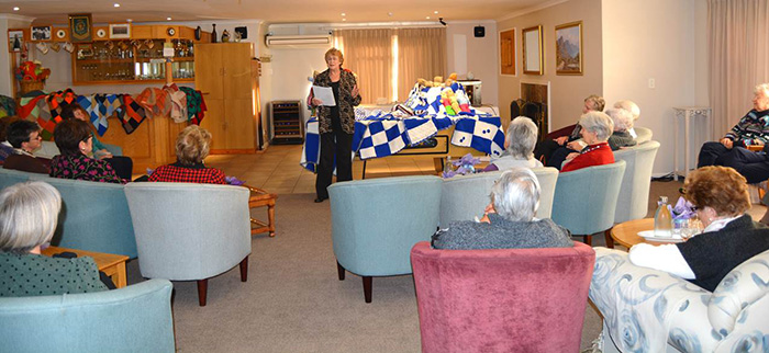 Well known South African actress, Wilna Snyman, pictured delivering poetry readings to the residents of Onrus Manor in Hermanus, who recently donated handcrafted blankets and teddy bears to Executive Mayor Nicolette Botha-Guthrie for distribution to the needy on Mandela Day.