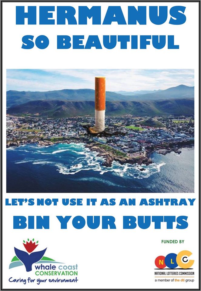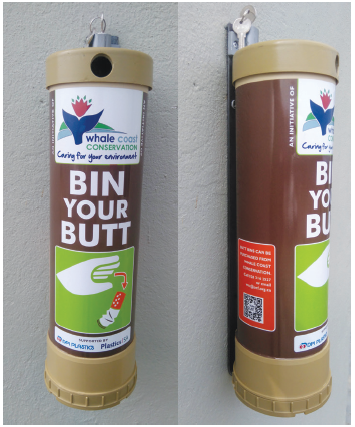 Businesses and other organisations looking for permanent cigarette butt litter solutions can contact the Whale Coast Conservation for a designed butt bin. The bins are locally manufactured and thus provide employment. You can sponsor a bin at a cost of R450 per bin. For more information, contact Anina Lee at 028 316 2527 or This email address is being protected from spambots. You need JavaScript enabled to view it.