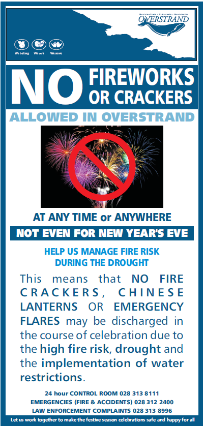 All fireworks have been banned throughout the Overstrand this summer due to the drought and very high fire risk.