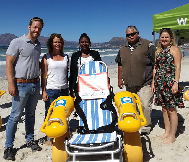 Overstrand Blue Flag co-ordinator, Lauren Rainbird, was overwhelmed with joy when WESSA and the Ford Motor Company Fund donated an amphibious wheelchair to the Grotto #Blue Flag Beach. Pictured here are left Rob Slater (Wessa's Blue Flag manager), Lauren Rainbird (Blue Flag co-ordinator for Overstrand), Dudu Nxele (Ford Wildlife Foundation), Richard Scholtz (Superintendent: Parks, Sportsfields and Beaches for Overstrand) and Linda du Plessis (Ford Wildlife Foundation).