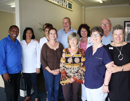 David Sawtelle’s Pam Golding team with Cllr Andrew Komani, Deputy Mayor Elnora Gillion, Cllr Riana de Coning, Mayor Dudley Coetzee, Glenda Kitley and Frieda Lloyd.