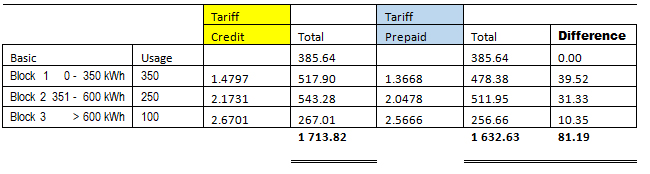 Many residents have asked if the basic usage on a credit meter is at a total cost of X amount, what the same amount of usage will cost on a pre-paid meter.