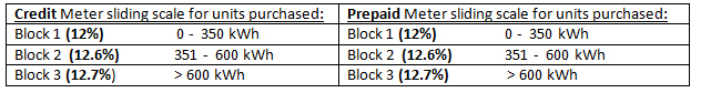 Over and above the basic charge, sliding scale tariff sets (for credit meters and prepaid meters) were approved by the National Energy Regulator (NERSA), for purchasing of electricity units (please refer to the information in the Table below, comparing two sets of tariffs, one for Conventional (credit) meters and another set of tariffs for pre-paid meters.)