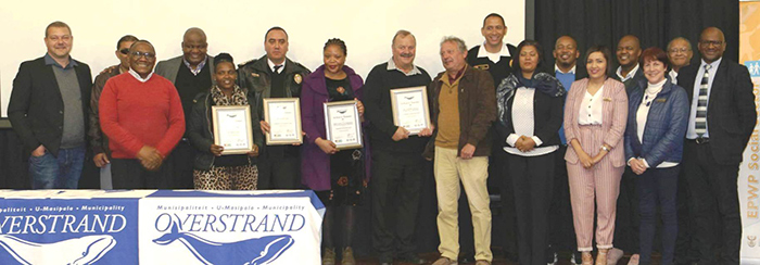 Pictured here are Gerhard Smith (OM Manager of Social Development), an OAPD representative, Xolile Kose (OM Manager of Local Economic Development), Mzamadoda Mfene (Manager: EPWP Environmental & Cultural Sector), Lester Smith (OM Fire Chief), Ntombi Mtholo (OM Senior Support Officer of Protection Services), Francois Myburgh (OM Area Manager for Gansbaai Administration), the late Mike Bartman (OM Deputy Director of Community Services), Angelo Aplon (OM Assistant Fire Chief), Deputy Mayor Elnora Gillion, Solomzi Madikane (OM Director of Economic and Social Development & Tourism), Chantelle Hill (OM Co-ordinator of EPWP), Tembela Ndlazi (Manager EPWP: Social Sector), Cllr Kari Brice (OM Mayoral Committee Member and Chairperson for Social & Economic Development and Tourism), Mzimkulu Gusha (Director: EPWP Department of Public Works) and Richard Petersen (Chief Director: Strategic Planning and Co-ordination)