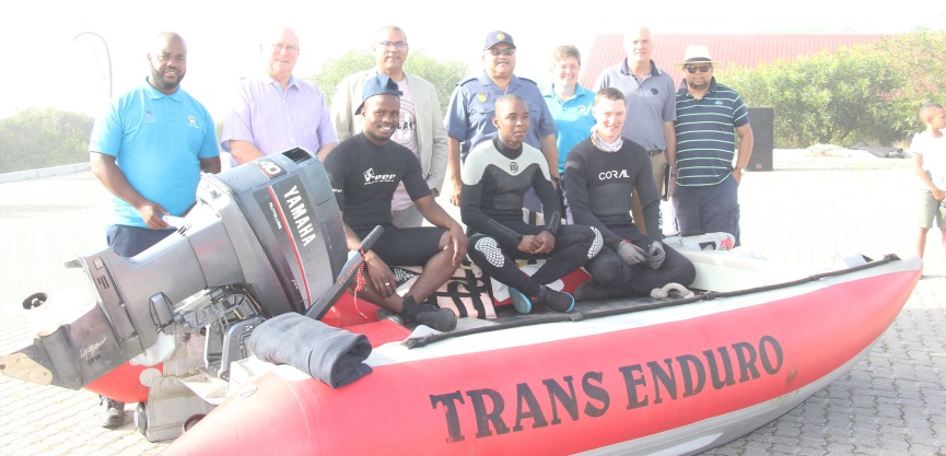 Pictured here are Trans Enduro Exercise Commander Lt Phitlho, Mayor Dudley Coetzee, Acting Senior Manager Anver Wyngaard, Capt Wiliams of Hermanus Police, Military Academy Chaplan Herbst, Retired Chaplan Kotze and Cllr Arnie Africa with the sea team.