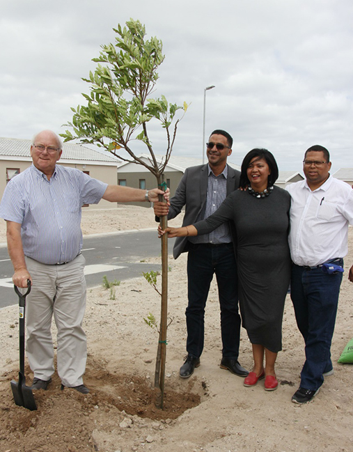 Before handing over the keys to the beneficiaries, four trees - Dodonaea viscosa (Sand olive); Ekebergia capensis (Cape ash); Apodytes dimidiata (White pear) and Syzygium cordatum (Water berry) were planted. The trees were donated by Walker Bay Nursery.