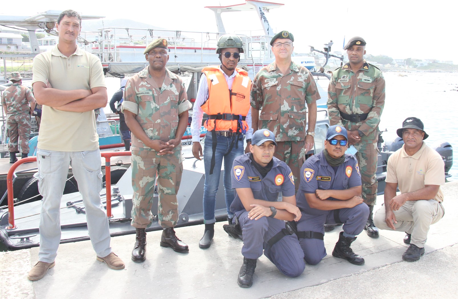 FIGHTING ABALONE POACHING IN THE OVERSTRAND Ashley Visagie (CapeNature), Colonel Gaba Mahanjana (Joint Tactical Headquarters Western Cape), Deputy Mayor of Overstrand Municipality Lindile Ntsabo, Lt-Col Adriaan Lotriet (SANDF Staff Officer for Operations), Lieutenant Samkelo Maqolo (Operational Commander SA Navy). In front is Overstrand Law Enforcement officers Kyle Dickson and Bertie Lombard and far right is CapeNature’s Charles Meyer at the Kleinbaai Harbour.