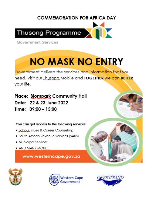 Get this help from the Thusong Mobile Outreach Programme on Wednesday, 22 and Thursday 23 June 2022 at the Blompark Community Hall in Gansbaai between 09:00 – 15:00.