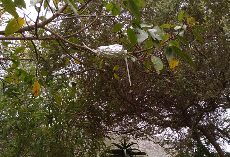 Hikers and people visiting the gardens, may notice little tin foil parcels hanging from some of the fruiting trees. The arborists are hopeful that in three months’ time, they will have grown a root ball so that the twig or small branch can then be transplanted and grown.