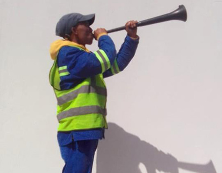 For the time being, the Eco Monitors (aka baboon criers) will alternate between whistles and vuvuzelas. The whistles and vuvuzelas will not be used throughout the day, it will be momentary sound to warn the residence only when the troops are entering the urban area.