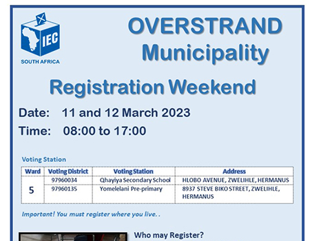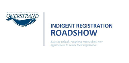 This is to remind residents that the Overstrand Municipality's Finance Department will assist needy households to register and/or re-apply for Indigent Subsidy support and to update the indigent database on Saturday, 11 March 2023 from 09:00 - 12:00.