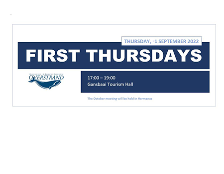 A reminder that Mayor Annelie Rabie and her team will be in Gansbaai on 1 September 2022 from 17:00 - 19:00. The First Thursday meeting will be hosted in the Gansbaai Tourism Hall.