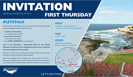 Overstrand Executive Mayor Dudley Coetzee, Mayoral Committee Members (Exco Councillors), the Municipal Manager and Top Management team will be hosting the first of Overstrand Municipality’s First Thursday events on 7 November 2019.