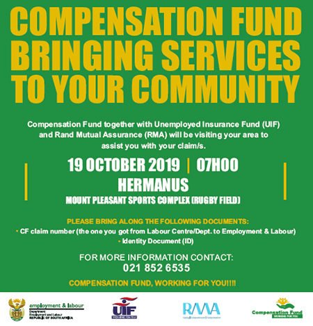 Compensation Fund, together with Unemployed Insurance Fund (UIF) will be visiting Hermanus on 19 October 2019 at the Mount Pleasant Sports Complex (rugby field) from 09:00 – 16:00.