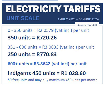 The electricity price is divided into several steps or blocks. In the Overstrand, the first block of electricity (350 kWh) is at the lowest price for all single phase connection electricity (60AMP). This includes households.